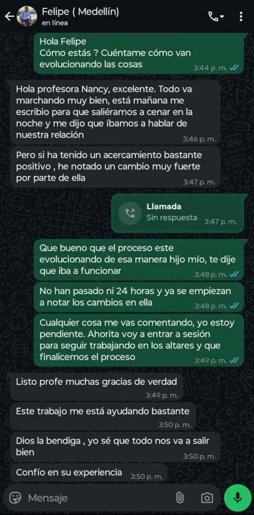 Soy NANCY Experta en rituales para la recuperación de la pareja. Amarres – Ligas – Dominios y Endulzamientos. Tengo el conocimiento para hacer que regrese contigo hoy mismo. si no ves resultados tu proceso es gratis.